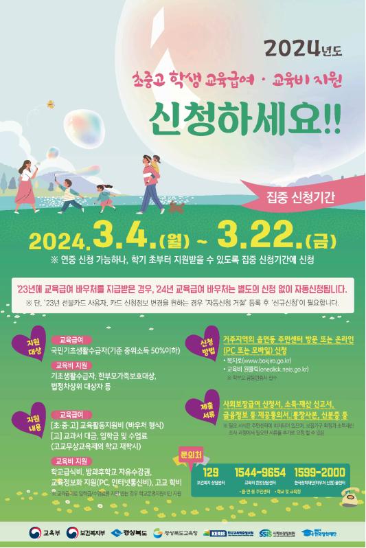 기존에 교육급여와 교육비 지원을 받는 학생은 다시 신청하지 않아도 되며 신규로 지원을 희망하는 보호자나 학생은 주소지의 읍·면·동 행정복지센터를 방문해 신청하거나 복지로 또는 교육비 원클릭 누리집에서 온라인으로 신청할 수 있다.