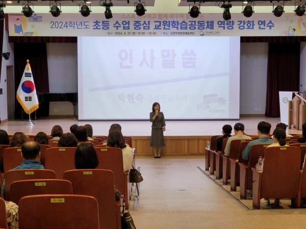 [AANEWS] 경북교육청은 27일 김천시에 있는 김천학생문화예술센터에서 교과교육연구회, 수업탐구교사공동체, 수업혁신교사학습공동체, ‘질문이 넘치는 교실’ 선도단 대표 교사 등 130여명이 참석한 가운데 2024학년도 초등 수업 중심 교원학습공동체 역량 강화 연수를 실시했다.