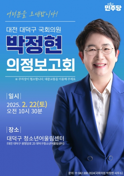 [아시아월드뉴스] 더불어민주당 박정현 국회의원이 22일 오전 10시 30분, 대전 대덕구 청소년어울림센터에서 의정보고회를 개최한다고 밝혔다.