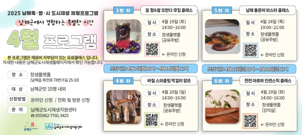 이번 4월 프로그램은 △꽃청·쌀오란다 쿠킹 클래스, △바질 스파클링 막걸리 양조 클래스. △남해 돌문어 파스타 쿠킹 클래스 △천연 아로마 인센스틱 클래스 등으로 구성됐다.