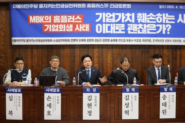 10일 오전 국회도서관 소회의실에서 열린 ‘MBK 홈플러스 기업회생 사태: 기업가치를 훼손하는 사모펀드, 이대로 괜찮은가’ 긴급 토론회는 더불어민주당 을지로위원회와 소상공인위원회, 홈플러스 공동대책위원회 등이 공동 주최했고 김현정·강준현·김남근·민병덕·이강일·오세희·송재봉·안도걸·유동수 의원, 조국혁신당 신장식 의원, 사회민주당 한창민 의원이 참석했다.