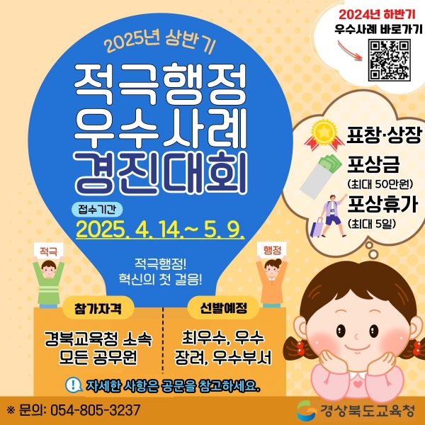 [아시아월드뉴스] 경북교육청은 공직사회의 적극행정 문화 확산과 공무원 사기 진작을 위해 ‘2025년 상반기 적극행정 우수사례 경진대회’를 개최한다고 15일 밝혔다.