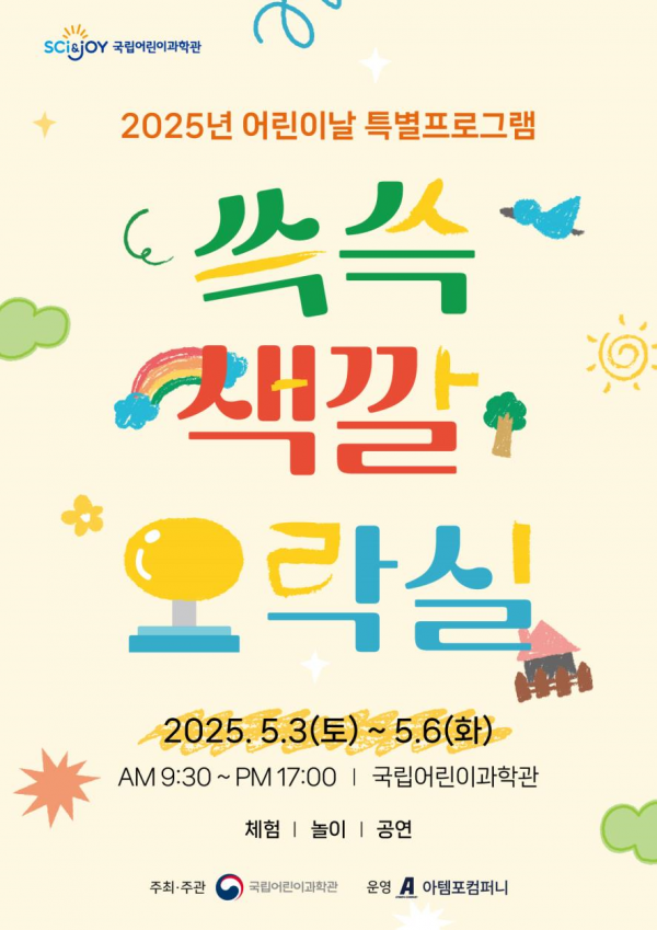 [아시아월드뉴스] 국립어린이과학관은 5월 어린이날을 맞아 온 가족이 함께 참여할 수 있는 과학문화행사 “쓱쓱 색깔오락실”을 5월 3일부터 5월 6일까지 개최한다.