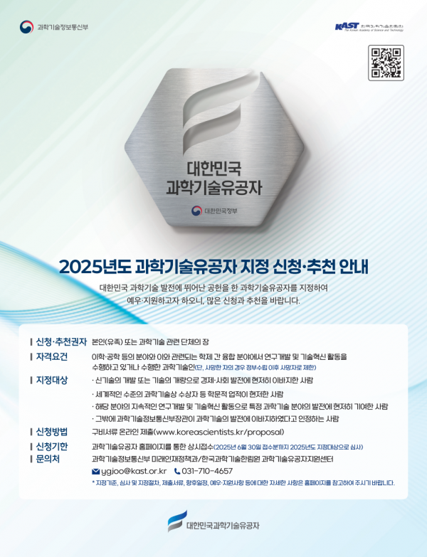 [아시아월드뉴스] 과학기술정보통신부는 ’ 25년 4월 29일 대한민국 과학기술 발전에 공헌한 과학기술유공자 지정을 위해‘2025년도 과학기술유공자 지정계획’을 공고한다.