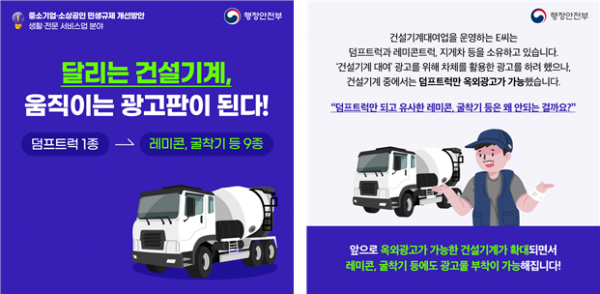 [아시아월드뉴스] 행정안전부는 자기광고가 가능한 건설기계와 전광판 사용이 가능한 자동차의 범위를 확대하는 내용의 ‘옥외광고물 등의 관리와 옥외광고산업 진흥에 관한 법률 시행령’ 일부 개정령안을 4월 30일부터 입법예고 한다고 밝혔다.
