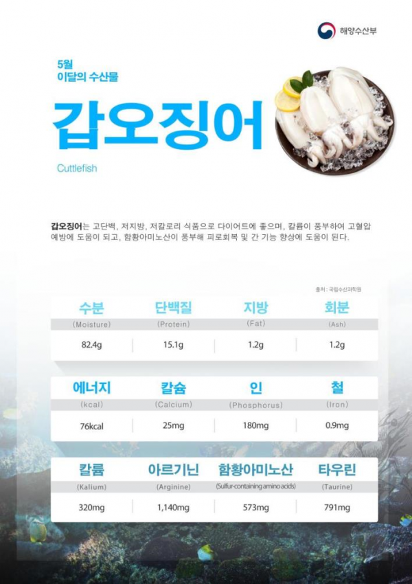 이달의 수산물 갑오징어, 키조개를 비롯한 수산물 관련 정보는 어식백세에서 자세히 확인할 수 있다.