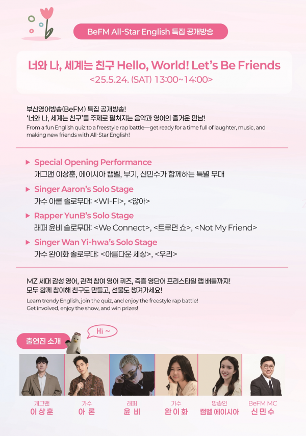 먼저, 부산영어방송 올스타 잉글리시 특집 공개방송은 ‘너와 나 세계는 친구’를 주제로 영화의전당 메인무대에서 오후 1시부터 2시까지 진행된다.