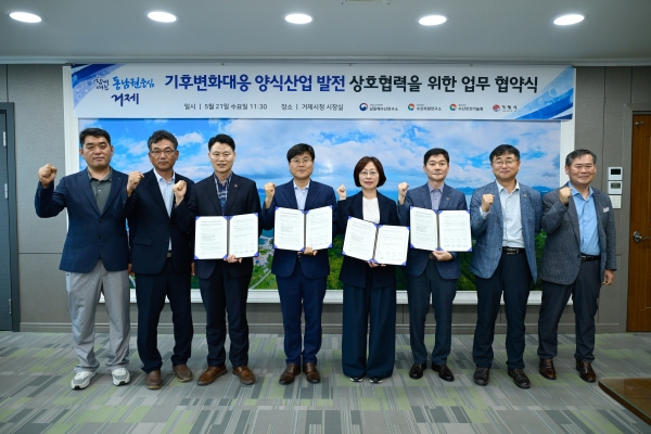[아시아월드뉴스] 거제시는 21일 남동해수산연구소, 경남도수산자원연구소, 경남수산안전기술원과 지속 가능한 양식산업 발전 및 기후변화 대응을 위한 상호 협력 협약을 체결했다고 밝혔다.