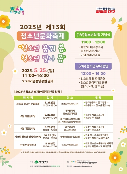 [아시아월드뉴스] 대구광역시는 5월 25일 오전 11시 2·28기념중앙공원에서 ‘2025년 제13회 청소년문화축제’를 개최한다.