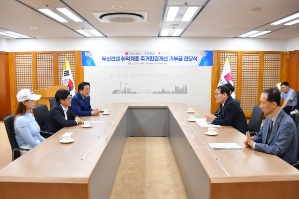 [아시아월드뉴스] 부산시는 어제 오후 2시 시청 국제의전실에서 두산건설 취약계층 주거환경개선 기부금 전달식을 개최했다고 밝혔다.