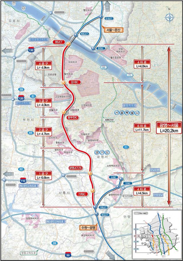 광명-서울 고속도로는 경기 광명시와 서울 방화동을 연결하는 총 연장 20.2km, 총사업비 2조 5,108억원 규모의 민간투자사업이다.