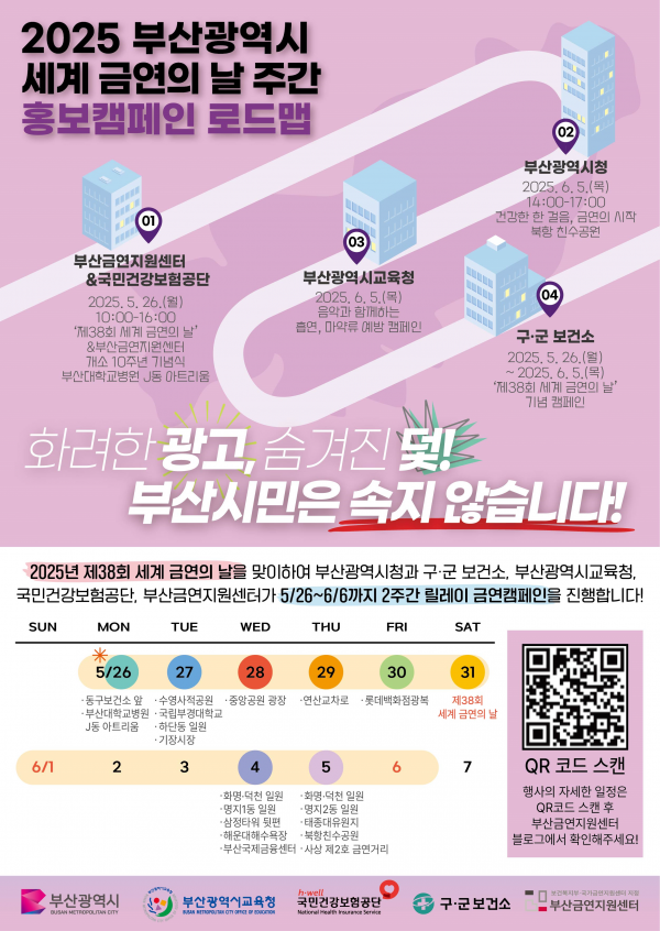 이번 금연 홍보 주간은 시를 비롯해 시교육청, 국민건강보험공단 부산울산경남지역본부, 부산금연지원센터, 16개 구·군 보건소 등 유관기관과 협력해 추진된다.