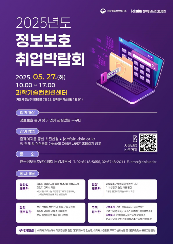 [아시아월드뉴스] 과학기술정보통신부는 한국정보보호산업협회와 함께 5월 27일 10:00부터 한국과학기술컨벤션센터에서 2025 정보보호 취업박람회를 개최한다고 밝혔다.