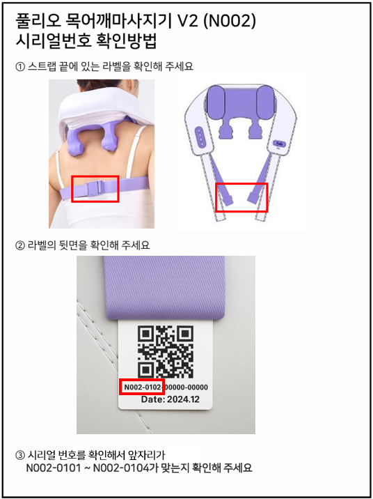 리콜 대상은 ‘24년 12월부터 ‘25년 1월 사이에 제조된 제품으로 마사지기 연결 끈에 부착된 표시 사항의 제품 시리얼 번호를 통해 확인 할 수 있다.
