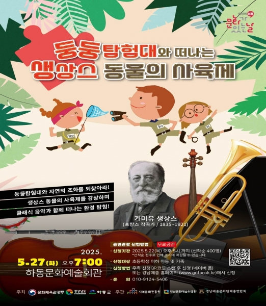 [아시아월드뉴스] 오는 27일 오후 7시, 하동문화예술회관에서 어린이와 가족을 위한 클래식 공연 ‘둥둥탐험대와 떠나는 생상스 동물의 사육제’ 가 개최된다.