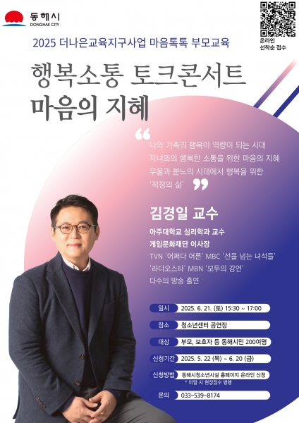 나와 가족의 행복이 중요한 역량이 되는 시대 흐름에 맞춰 ‘마음의 지혜’를 주제로 동해시청소년센터에서 오는 6월 21일 오후 3시 30분에 개최할 예정이다.