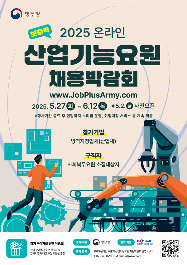 [아시아월드뉴스] 병무청은 5월 27일부터 6월 12일까지 17일간 ‘온라인 보충역 산업기능요원 채용박람회’를 개최한다.