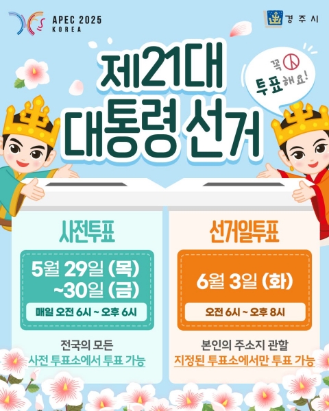 이를 위해 사전투표일 및 본투표일을 전후로 청사 전광판과 읍면동 마을 방송, 경주시 공식 SNS 등 온·오프라인 채널을 활용한 집중 홍보를 전개하고 있다.