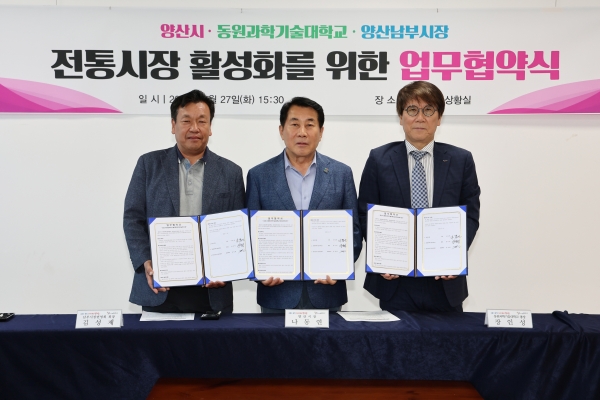 [아시아월드뉴스] 양산시는 27일 오후 시청 본관 3층 상황실에서 동원과학기술대학교, 남부시장번영회와 함께 ‘전통시장 활성화를 위한 업무협약’을 체결했다.