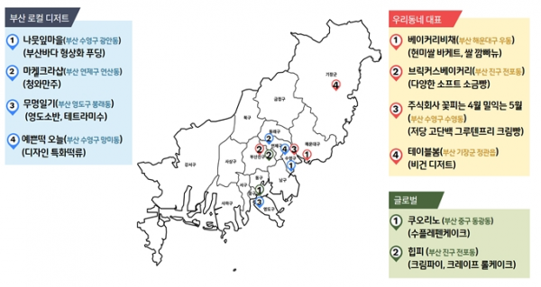 선정업체의 소재지를 보면, 부산의 대표 카페·디저트음식점 밀집 지역인 전포동 카페거리, 광안리 광리단길, 망미동 망리단길, 남포동, 영도 봉래나루 카페거리가 있다.