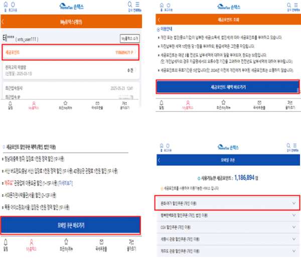 세금포인트를 사용해 입장료 할인 등 혜택을 받고자 하는 납세자는 모바일 손택스 앱에서 모바일 쿠폰을 발행해 해당 사용처 직원에게 제시하면 된다.