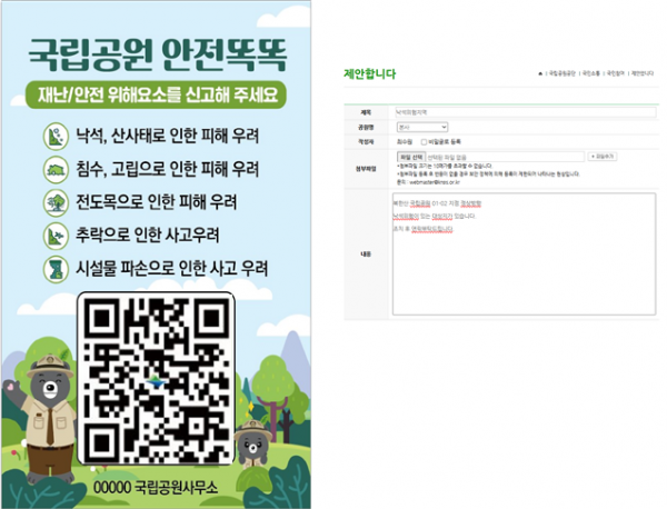 ‘국립공원 안전똑똑’은 국립공원을 이용하는 탐방객으로부터 비탈길 재해나 시설물 파손 등 인명 및 재산피해가 우려되는 위험 요인을 신고받아 신속히 조치해 사고를 사전에 예방하기 위해 도입됐다.
