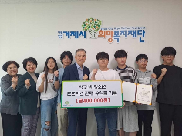 [아시아월드뉴스] 거제시학교밖청소년지원센터는 지난 28일 학교 밖 청소년 6명이 거제시희망복지재단에 뻔뻔비즈 운영 판매수익금 40만원을 기부했다고 밝혔다.