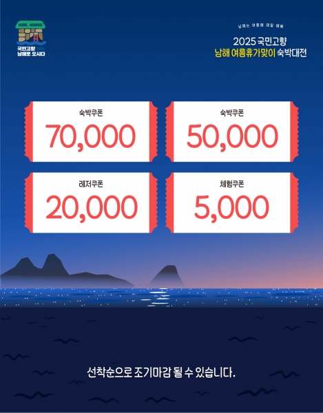 이연주 관광진흥과장은 “이번 ‘2025 국민고향 남해 여름휴가맞이 숙박대전’을 통해 여름휴가철 관광객들이 보다 큰 혜택 속에서 남해를 찾을 수 있도록 내실있게 준비했다”며 “앞으로도 계절별 특성과 관광 트렌드에 맞춘 다양한 이벤트와 연계 프로그램을 통해 관광객 유치에 힘쓰고 남해를 다시 찾고 싶은 매력적인 여행지로 만들어가겠다”고 말했다.