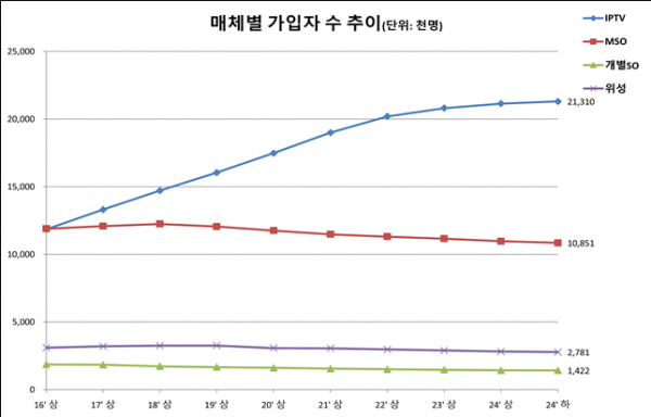 최근 3년간 인터넷 다중매체 방송 가입자 수는 꾸준히 증가했으나, 종합유선방송과 위성방송 가입자 수는 지속 감소해 ’ 24년도 하반기 기준 가입자 수는 인터넷 다중매체 방송 21,310,251 가입자, 종합유선방송은 12,273,100 가입자, 위성방송은 2,781,295 가입자로 나타났다.