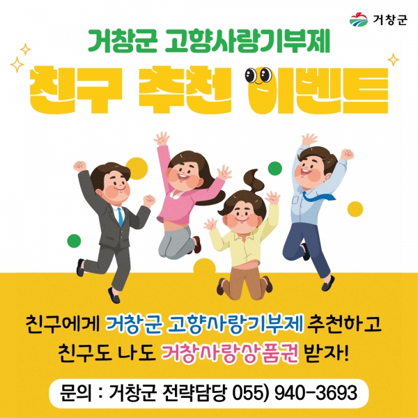 이번 친구 추천 이벤트는 거창군 고향사랑기부제 활성화와 더불어 지역 주민들도 고향사랑기부제에 동참할 수 있도록 기획됐으며 지역 상품권 추가 제공을 통해 생활 인구 증가에도 기여할 것으로 기대된다.
