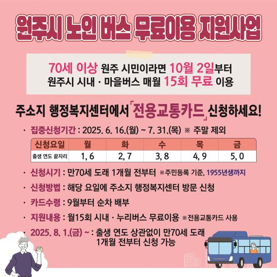 [아시아월드뉴스] 원주시는 어르신의 이동권 보장을 위해 ‘노인 버스 무료이용 지원사업’을 본격 추진한다고 밝혔다.