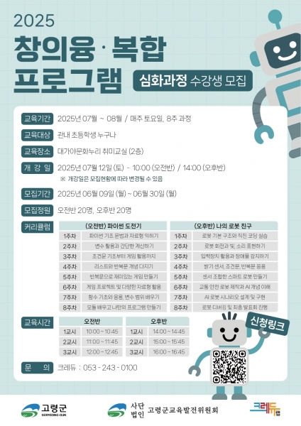 고령군은 “이번 창의융·복합 프로그램 심화과정은 단순 체험을 넘어, 문제 해결력과 융합적 사고를 기를 수 있도록 전문 강사와 함께 구성된 실습 중심 프로그램”이라며 “학생들에게는 미래 사회를 준비할 수 있는 소중한 기회가 될 것”이라고 전했다.