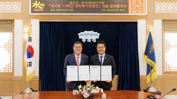 협약서는 제20회 1·2학년 대학축구연맹전의 개최 시기와 대회의 성공적인 개최를 위한 합천군과 한국대학축구연맹의 상호협력 내용을 담고 있으며 대회는 오는 8월 15일부터 31일까지 17일간 합천군 군민체육공원 인조구장 일원에서 개최된다.