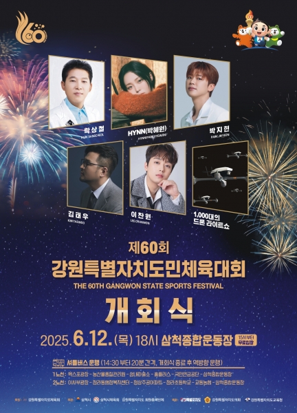 한편 제60회 강원특별자치도민체육대회는 오는 6월 12일부터 16일까지 5일간 삼척종합운동장과 종목별 경기장에서 열리며 개회식은 6월 12일 오후 6시 삼척종합운동장에서 폐회식은 6월 16일 오후 4시 삼척시민체육관에서 진행될 예정이다.