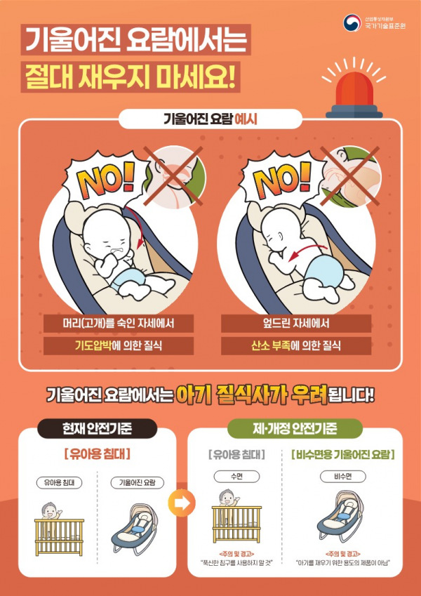 아울러 ‘비수면용 기울어진 요람’에 ‘수면용으로 제작된 것이 아님’을, ‘유아용 침대’에 ‘푹신한 침구를 사용하지 말 것’을 명확히 표시하도록 했다.