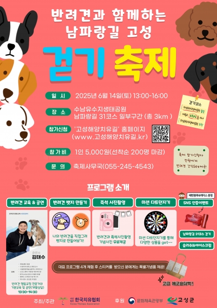 군 관계자는 “이번 걷기축제가 반려인들에게 특별한 추억이 되고 고성의 관광자원과 반려문화 확산에 기여하는 계기가 되길 바란다”고 전했다.