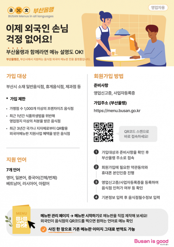 오는 6월 19일까지 진행되며 해당 기간 ‘부산올랭’을 통해 외국어 메뉴판을 1개 이상 제작한 시 내 음식점 영업자라면 누구나 참여할 수 있다.