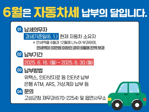 [아시아월드뉴스] 고성군은 2025년 제1기분 자동차세 21억 9,400만원을 부과하고 납세자들이 6월 30일까지 기한 내 납부를 할 수 있도록 안내에 나섰다.