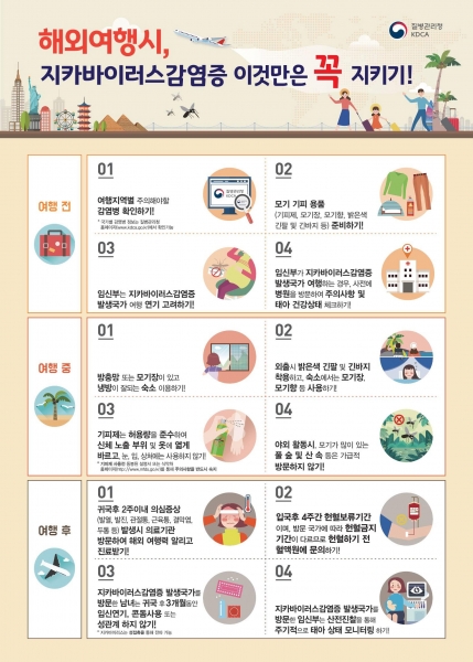 지카바이러스 감염증은 아직까지 예방백신이나 치료제가 없어 모기에 물리지 않는 것이 가장 중요하며 주요 예방수칙으로는 위험 국가 방문 시 밝은색 긴팔 상의, 긴바지 착용, 모기 기피제 사용 및 모기장 방충망 설치, 야외활동 시 시간 단축, 진한 향수, 짙은색 옷 착용 자제 등이다.