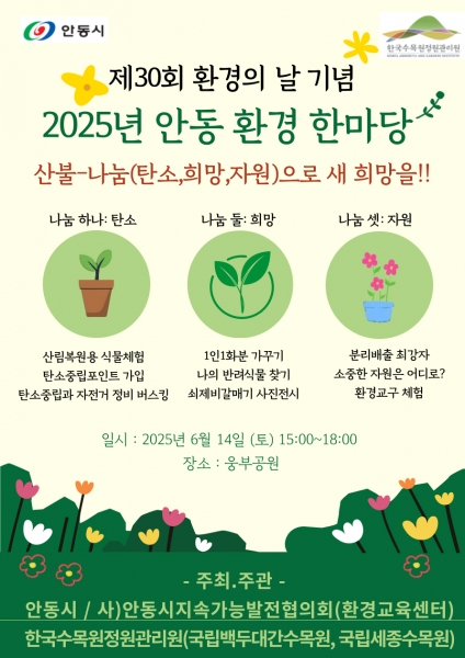 [아시아월드뉴스] 안동시는 제30회 환경의 날을 기념해 오는 6월 14일 오후 3시부터 웅부공원 일원에서 ‘2025 안동 환경 한마당’ 행사를 개최한다.