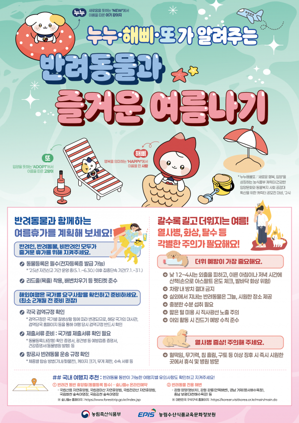 [아시아월드뉴스] 농림축산식품부는 본격적인 여름철을 앞두고 반려동물과 함께 휴가를 보내려는 반려인을 대상으로 여행 전 준비 사항과 여행지 정보 등을 소개하고 무더위에 대비한 반려동물 건강관리 방법을 안내했다.