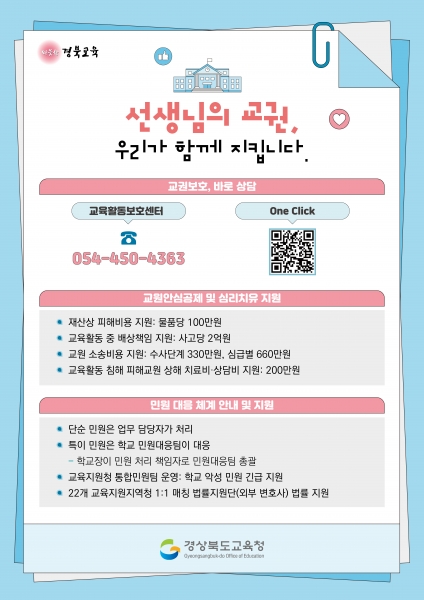 [아시아월드뉴스] 경북교육청은 도내 모든 교원을 대상으로 ‘교권보호 바로상담’ 안내장과 안내 카드를 제작·배부해 교권 보호 지원을 강화한다고 16일 밝혔다.