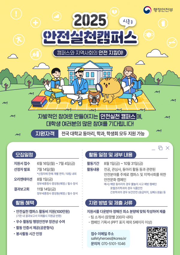 [아시아월드뉴스] 행정안전부는 6월 16일부터 7월 4일까지 ‘2025 안전실천 캠퍼스’ 참가자를 모집한다.