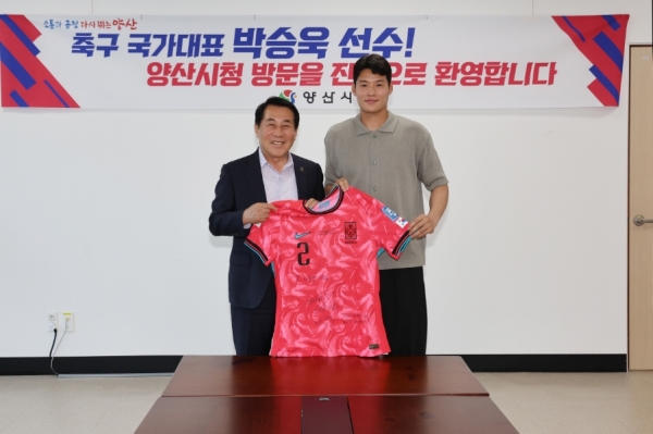 [아시아월드뉴스] 양산시는 지역출신 축구 국가대표 박승욱 선수가 지난 12일 양산시청을 방문해 나동연 양산시장과의 면담시간을 가졌다고 밝혔다.