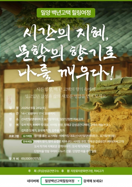 [아시아월드뉴스] 밀양시가 오는 28일 유서 깊은 고택과 현대인의 감성을 결합한 특별한 힐링 체험 프로그램‘밀양 백년고택 힐링여정’을 개최한다고 17일 밝혔다.