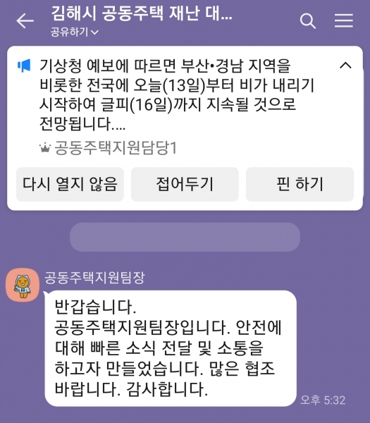 [아시아월드뉴스] 김해시는 재난 발생 시 다수 시민이 거주하는 공동주택의 신속한 대응을 위해 ‘공동주택 재난 대응 오픈채팅방’을 운영한다고 17일 밝혔다.