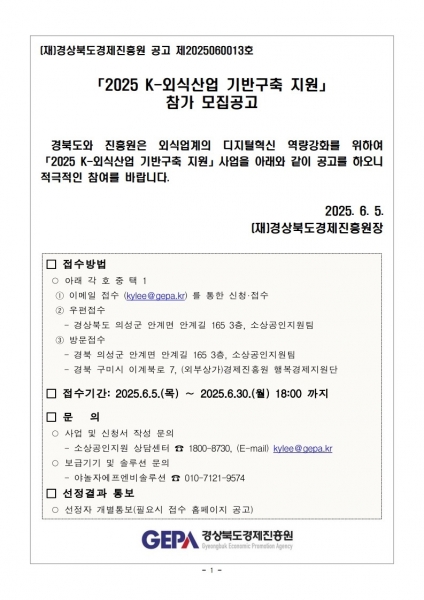 [아시아월드뉴스] 안동시는 경상북도경제진흥원과 업무협약을 맺고 오는 6월 30일까지 ‘K-외식산업 기반 구축사업’에 참여할 외식업체를 모집한다고 밝혔다.