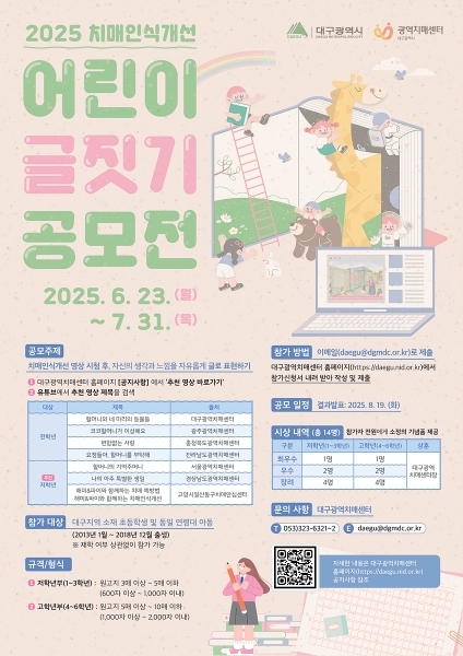 [아시아월드뉴스] 대구광역시는 어린이들이 치매에 대한 인식과 이해를 높이고 부정적인 인식을 개선해 치매와 함께 살아가는 사회를 만들고자 ‘2025년 치매인식개선 어린이 글짓기 공모전’을 개최한다.