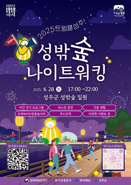 [아시아월드뉴스] 성주군은 야간관광 특화도시 조성사업의 일환으로 오는 6월 28일 오후 5시~22:00까지 성밖숲 및 용산이천길 일원에서 ‘트윙클 성주 성밖숲 나이트 워킹’행사를 개최한다.