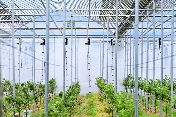 스마트사과원은 골든볼, 이지플 등 조·중생종 4개 품종을 밀식한 약 500평 규모의 5연동하우스로 조기수확 및 자동화 재배기술 연구를 위해 올해 4월 조성을 완료했다.